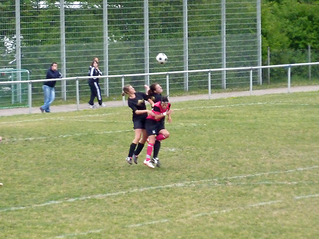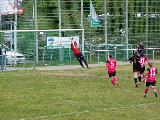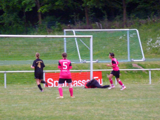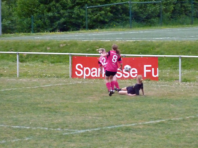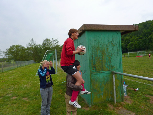 Artistische Ballmädels ? Nein, der Ball wurde zuvor nur von dem Dach der Ersatzbank herunter geholt.