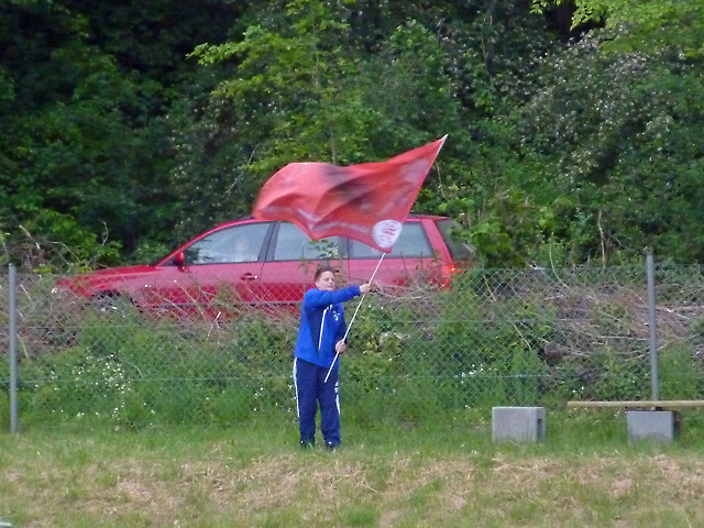 Wolfgang Zientek (noch völlig trocken) präsentiert dem Schiedsrichter die Rückennummer von Vanessa Weber