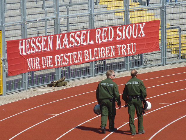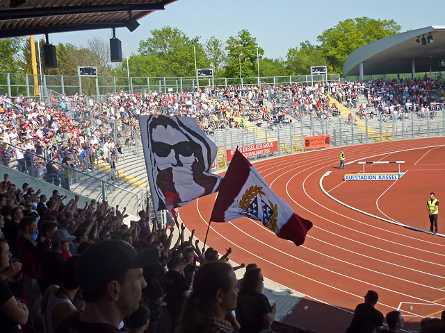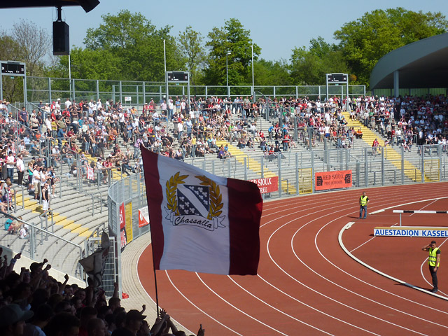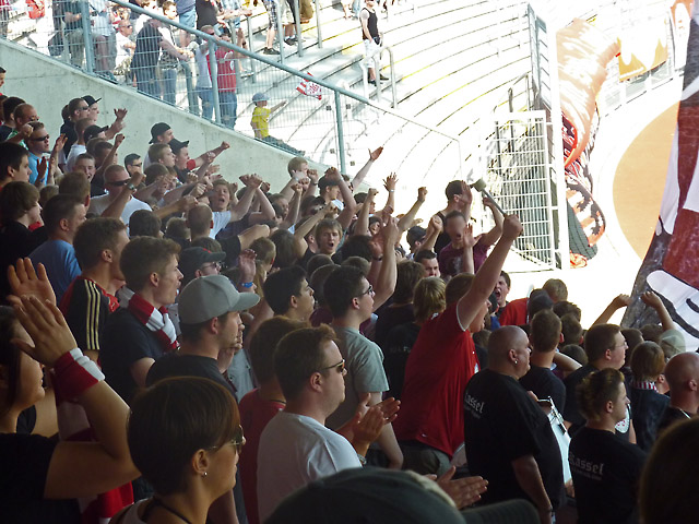 Die Scena Chassalla 913 gibt wie gewohnt alles. Trotz der besseren Sicht - weil kein nachträglich erhöhter Zaun und der besseren Akustik ist die Gesamtlautsärke doch nicht so gewaltig, wie sie vor der "Spaltung" der Fanscene auf der Nordkurve war.