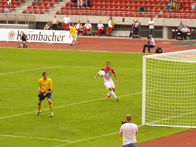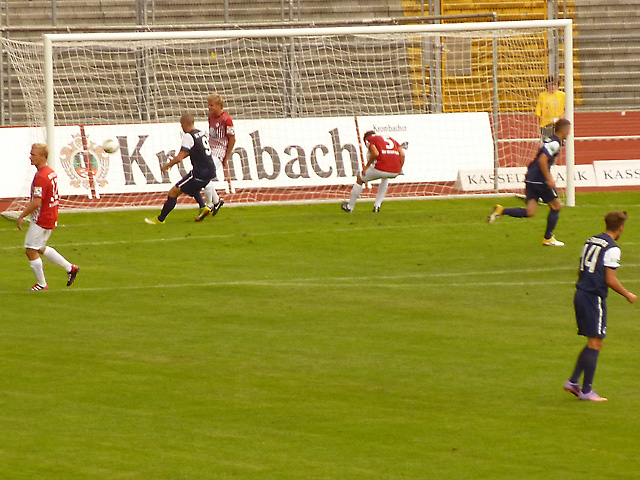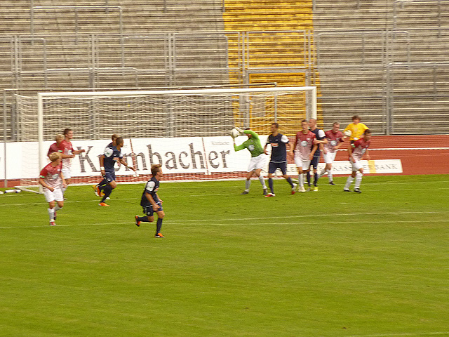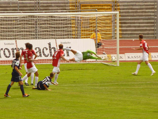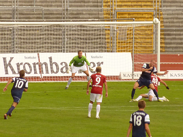 Der Schuss des Breisgauers geht nur haarscharf am rechten Pfosten vorbei. Hätte Domaschke ihn mit seiner Parade noch erwischen können?