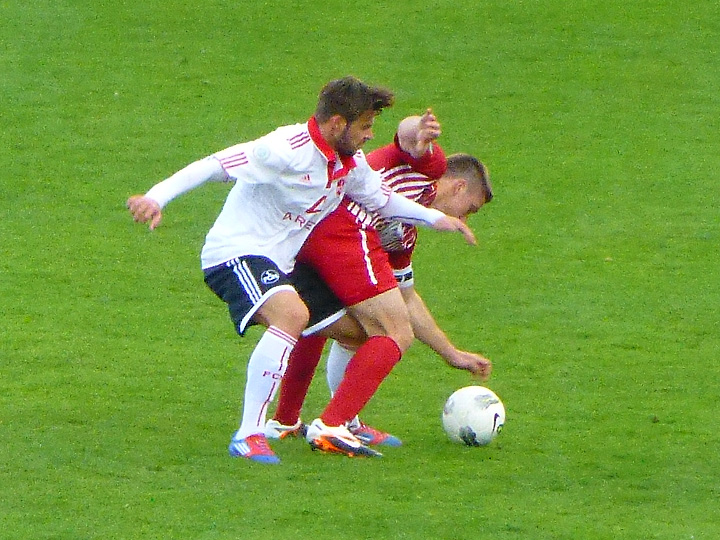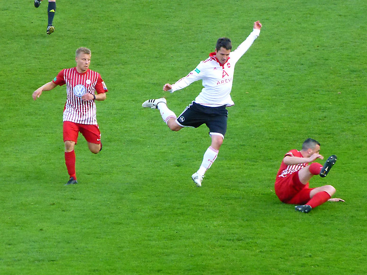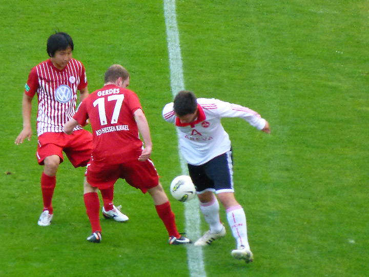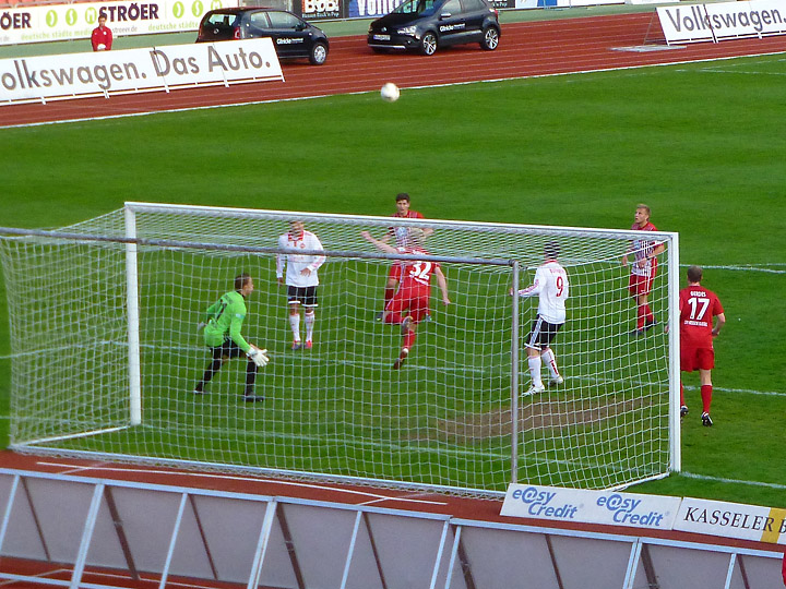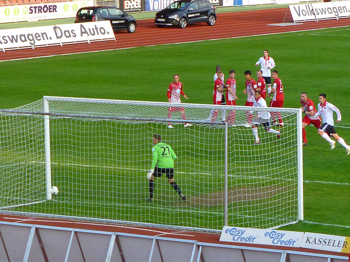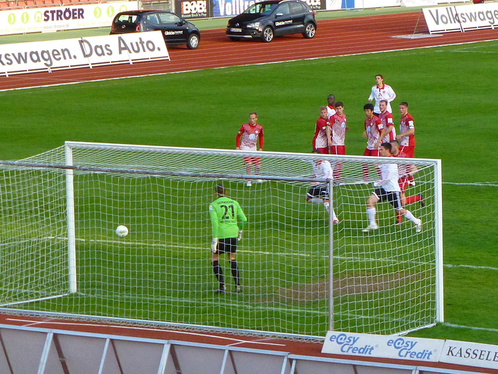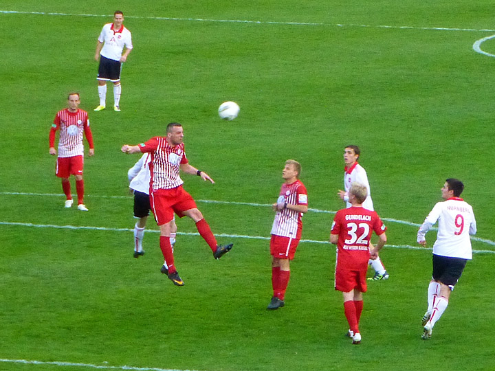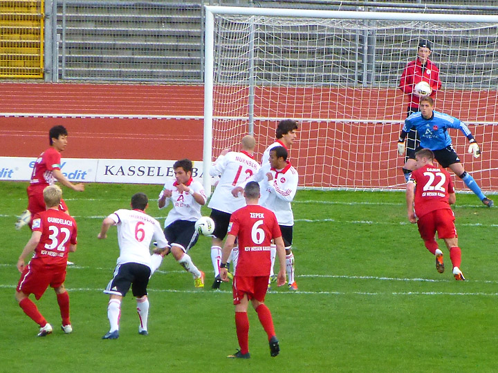 Freistoß für Kassel. Der Ball knallt aber in die Nürnberger Mauer