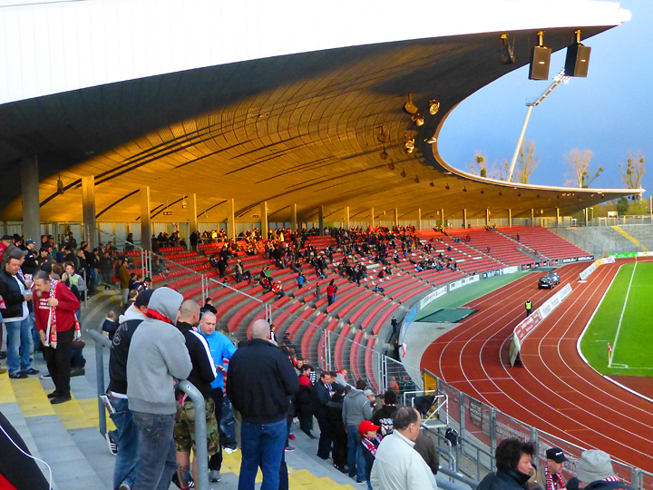 Der Sonnenuntergang lässt das Dach der Osttribüne in warmen Licht erstrahlen. Allerdings wurde es jetzt doch merklich