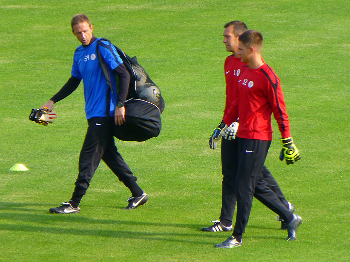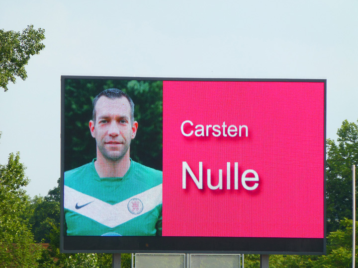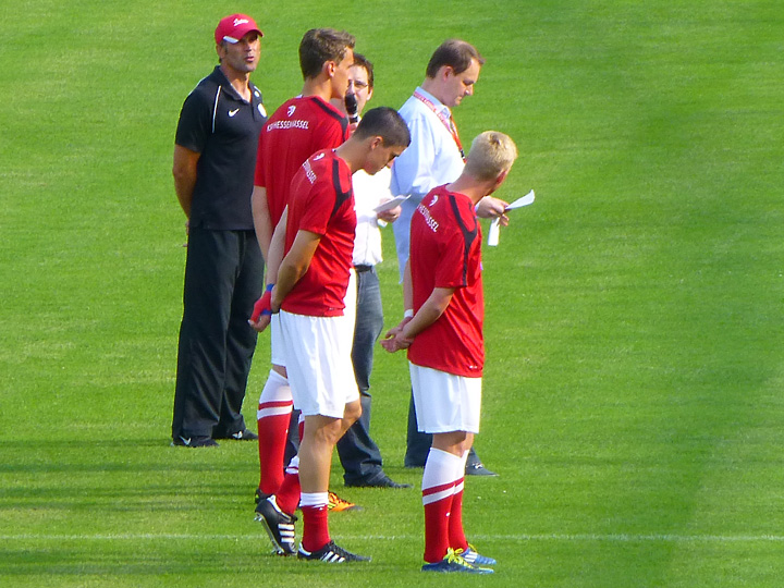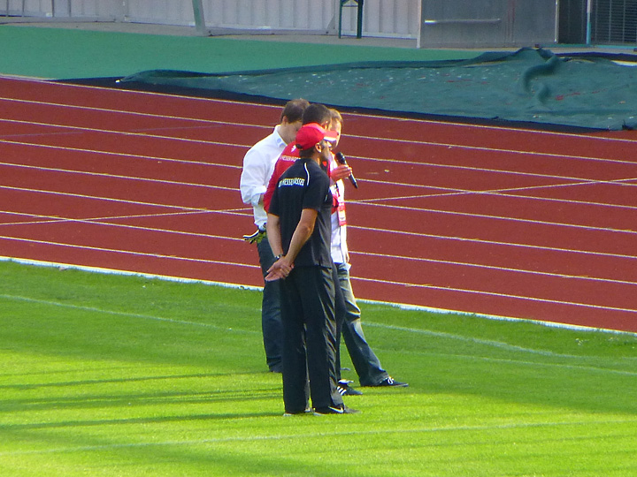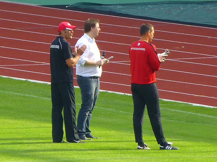 Während die Feldspieler vorgestellt werden, gehen Sven Hoffmeister, Carsten Nulle und Tobias Schlöffel zum Nordtor um sich aufzuwärmen