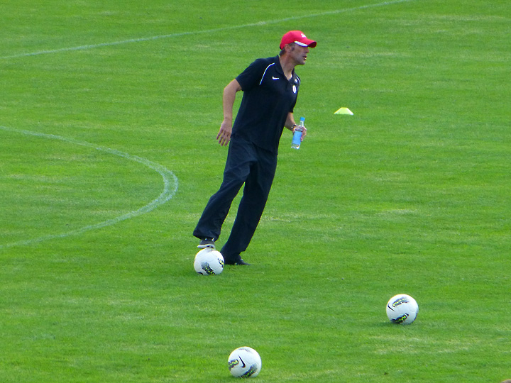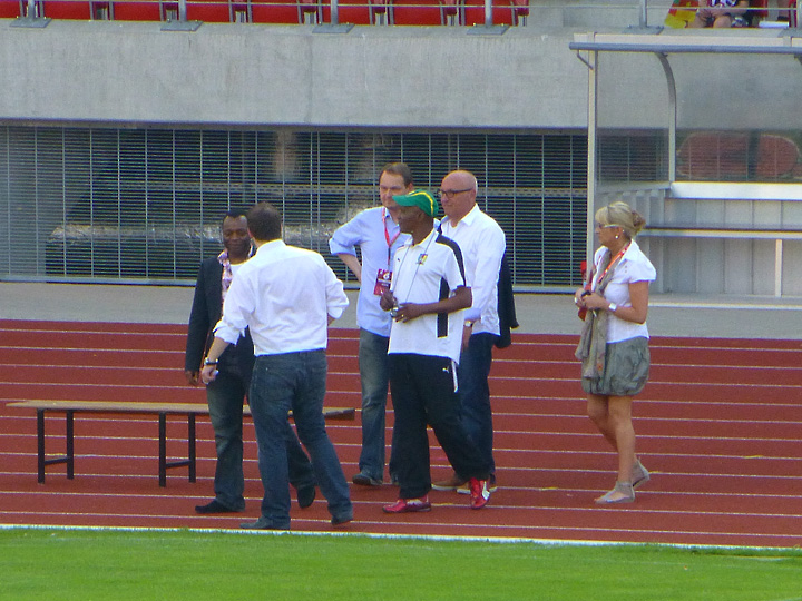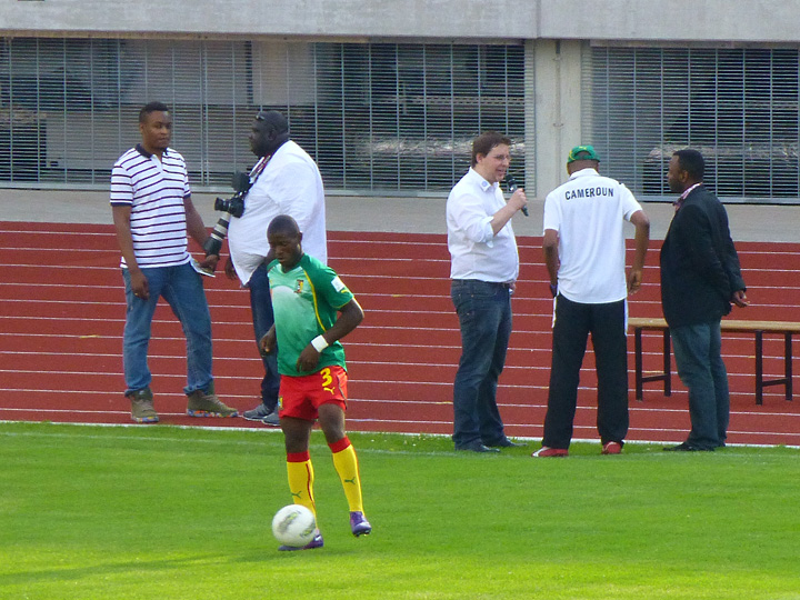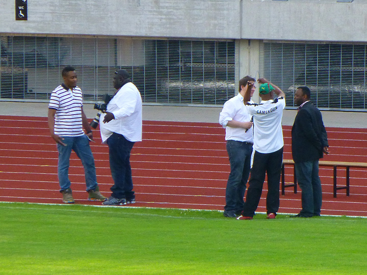 Der Dolmetscher wird "konsultiert", damit der Trainer der Kameruner ein paar Worte sprechen kann