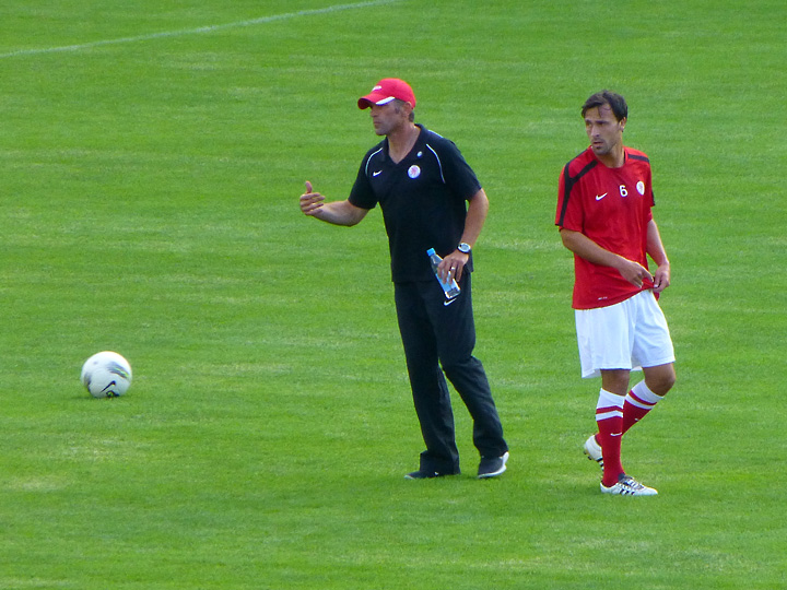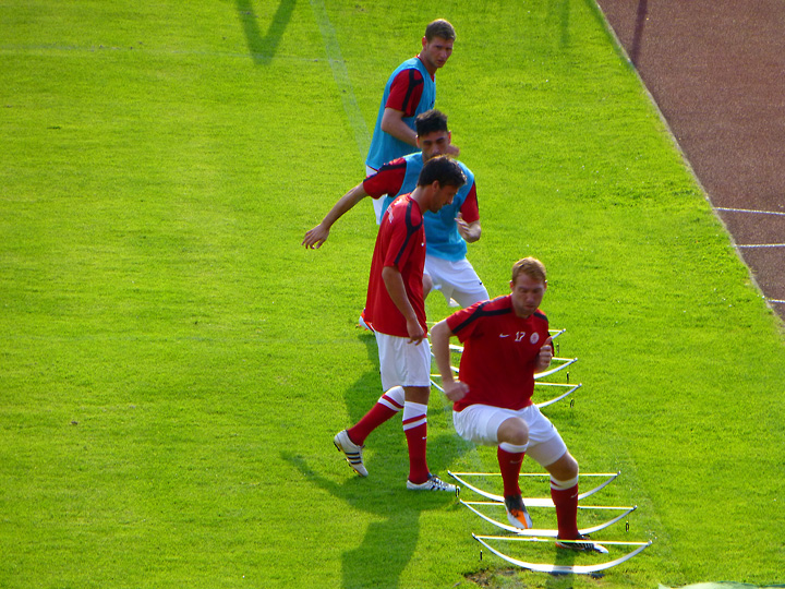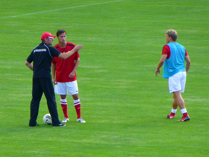 Derweil machen sich unsere Spieler weiter warm, wie hier Merle, Pinheiro, Becker und Hammann