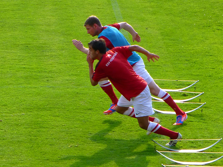 Gallus und Dieck starten zum Kurzsprint. Ohne Leibchen stehen Becker, Rahn und Hammann bereit. Mit Leibchen: Schmeer, Pinheiro und Merle