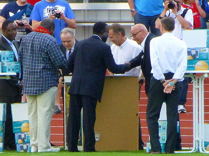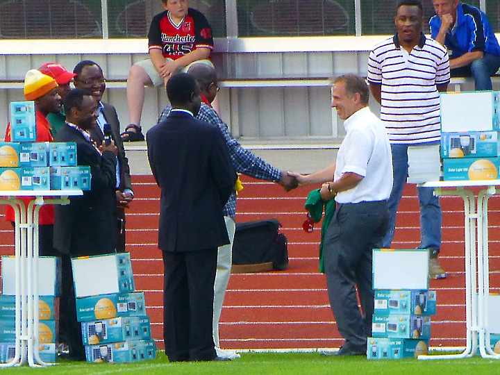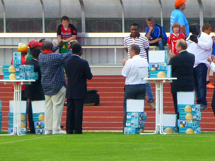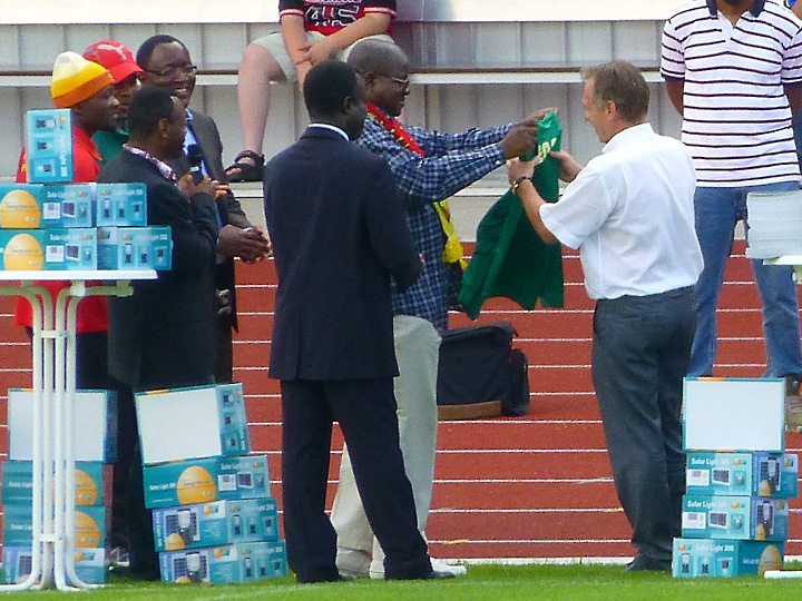 Die am Sonntag von allen Kamerunern Spielern unterzeichneten Spieltagsplakate werden als Geschenke überreicht. Bernd Mart bedankt sich höflichst und freudig. Netter Kerle übrigens