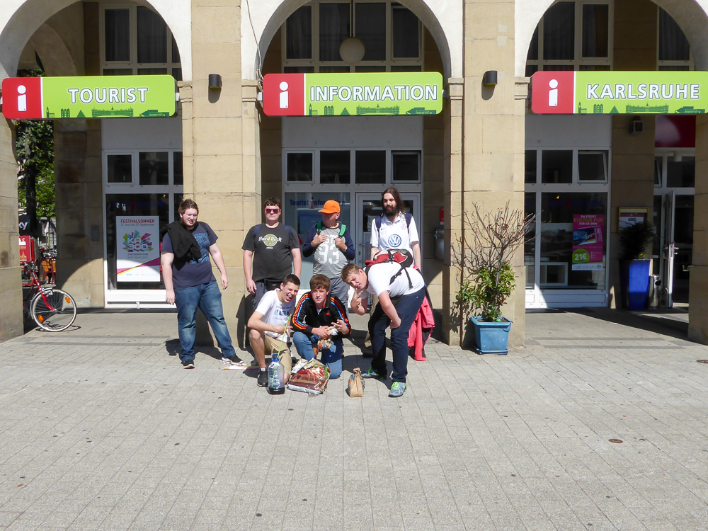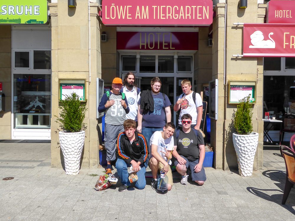 11:45 Uhr. Karlsruhe. Ein kleines Gruppenfoto von einigen Mitfahrern. Andere ältere KSVer (aus meiner Sicht ;-) ) sind ihre eigenen Wege gegangen. Doch momendema: "Tourist Information Karlsruhe" ist kein schöner Hintergrund. Gleich daneben gibt's ein Hotel mit passendem Hintergrund....