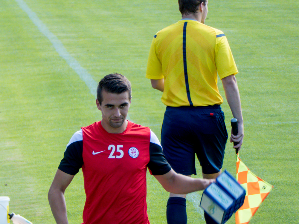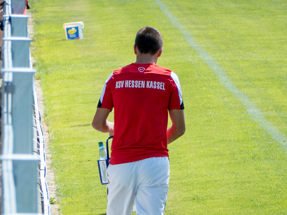 Das Spiel läuft und Marco Dawid verteilt auf dem Platz Getränke.