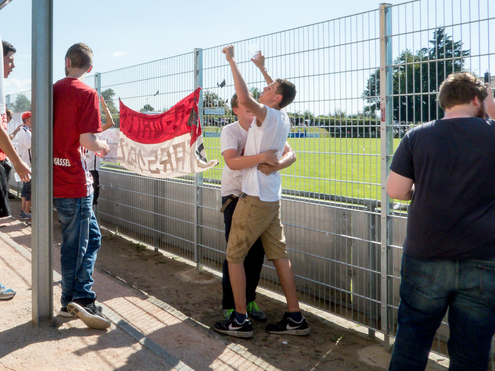 Auch den Pepic's überkommt großes Unverständnis über Comvalius' gelb-rote Karte, die Comvalius selbst noch nicht recht verstehen kann, wie man im Hintergrund gerade noch so erkennen kann. Der Schiri - wenn man ihn überhaupt so nennen kann - war die größte Pfeife, die ich seit langem gesehen habe. Und da er noch Südhesse ist, könnte man schon so einige Vermutungen anstellen. Was ein blödes, unfähiges Arschloch!