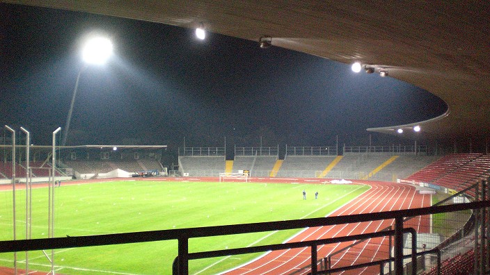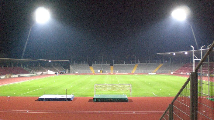Das erhellte Auestadion vom Weinberg aus betrachtet.