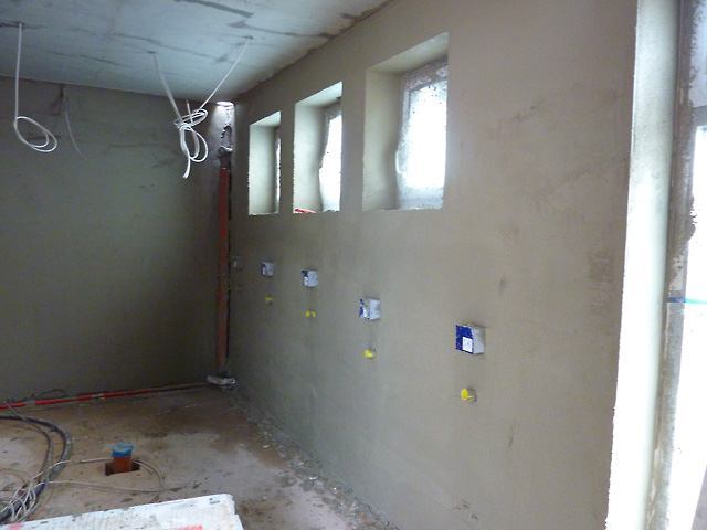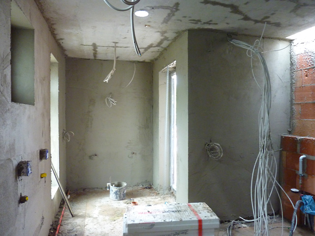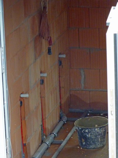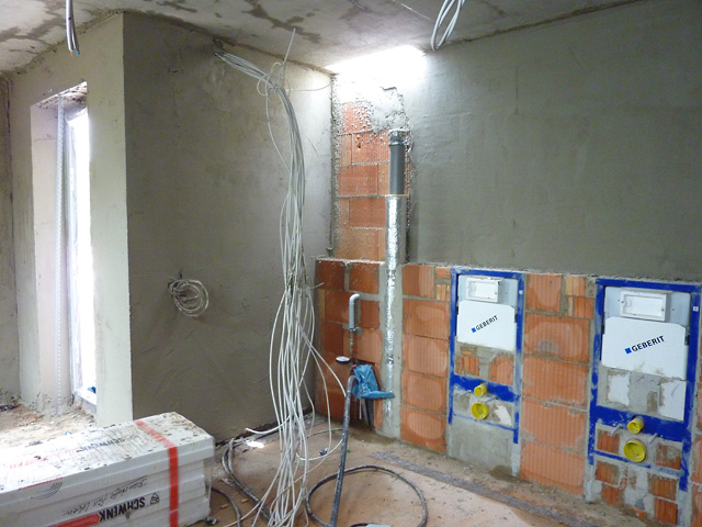 Alle Rohre und Stromleitungen /-kabel wurden zuvor verlegt. Demnächst kann gefliest und danach die sanitären Einrichtungen eingebaut werden.