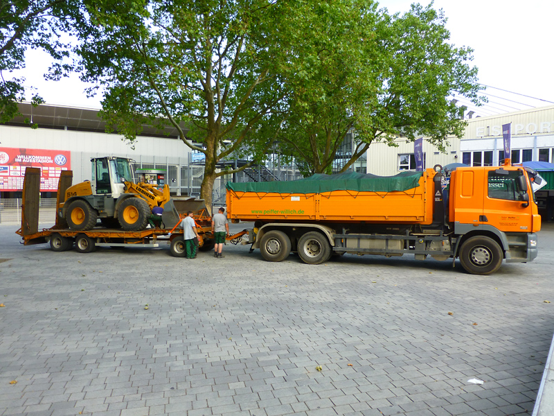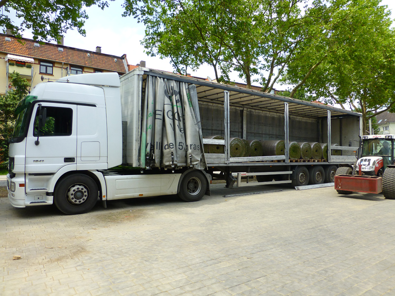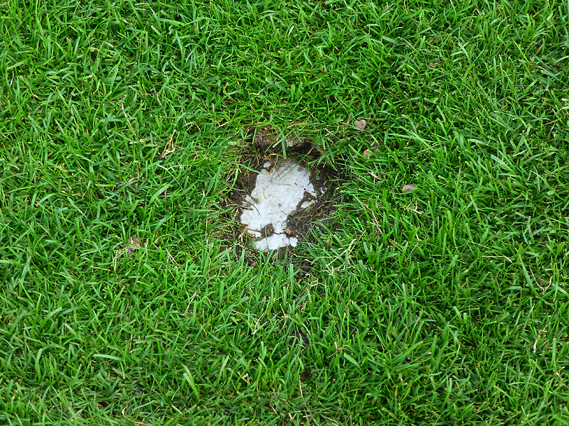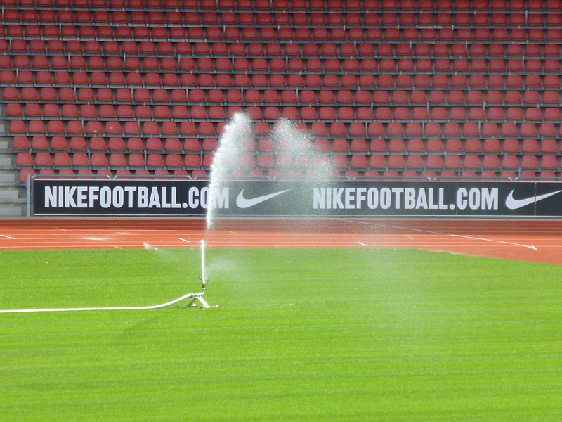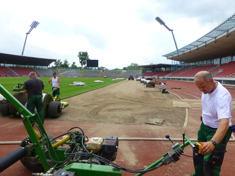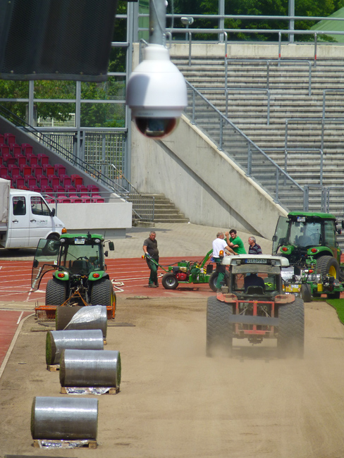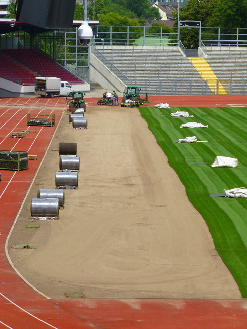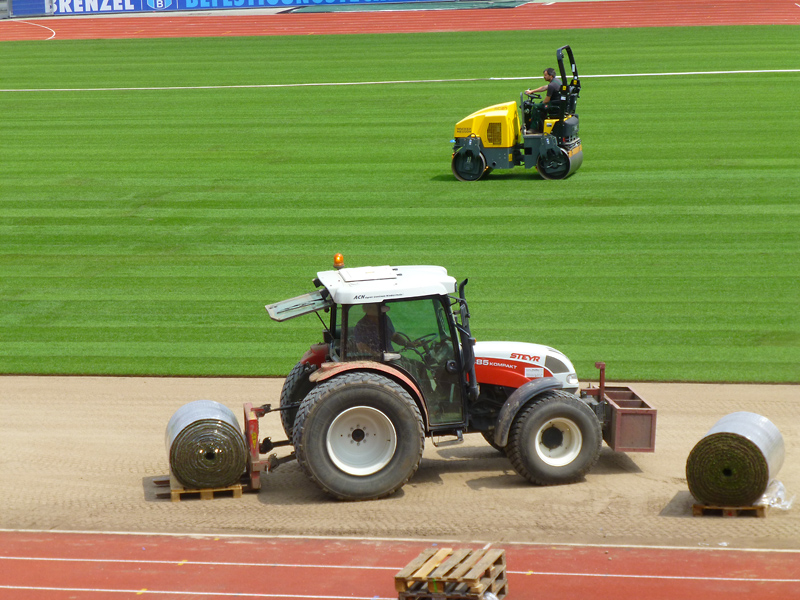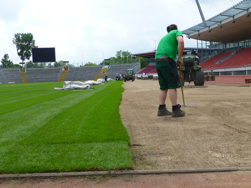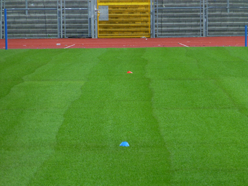 Ein interessierter Zuschauer, mit dem ich ins Gespräch kam, wunderte sich über diese kurvenmäßige Verlegung und fragte mich, ob das nicht kerzengerade verlegt werden müsse, worauf ich ihm entgegnete, dass das dem Rasen egal sei, da er ja eh zusammen wächst und man später davon nicht den kleinsten Hauch sehen würde. Darauf er: "Ja, aber die Bahnen sind ja unterschiedlich gefärbt, das sieht man doch später. Müssen die Helligkeitsunterschiede eigentlich nicht parallel zum Tor verlaufen?" Daraufhin ich: "Keine Sorge, Grashalme haben die wundersame Eigenschaft