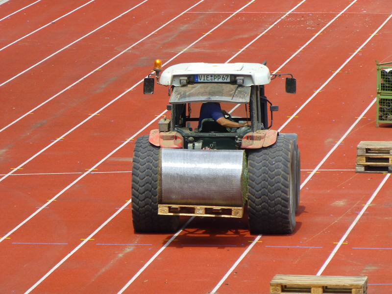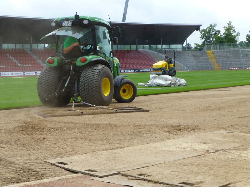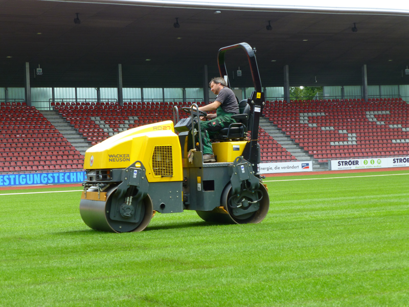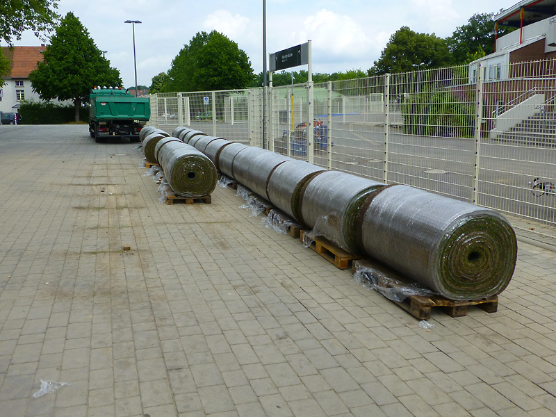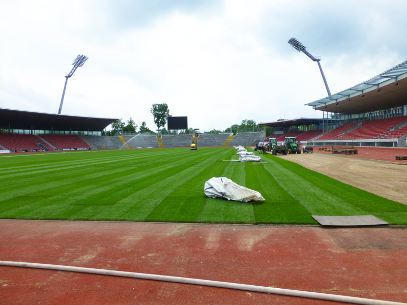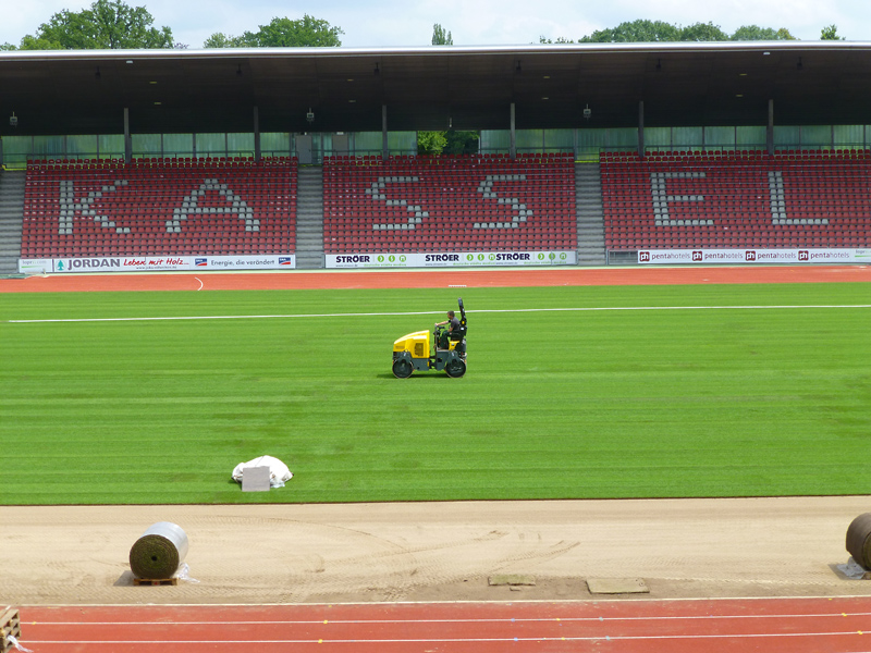 sich aufzurichten und da die Rasenbahnen ja aufgerollt sind, sind die Halme halt verbogen. Und da mal von oben nach unten und bei der nächsten Bahn wieder engegengesetzt abgerollt wird, entsteht halt dieses Muster. In 2 - 3 Wochen sieht man nichts mehr davon. Und das typische Fußballfeldmuster könnte dann später ein Rasenmäher machen."