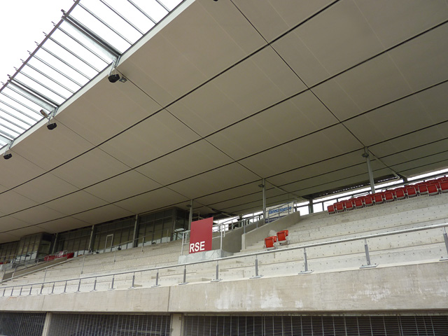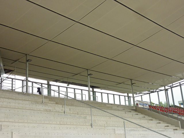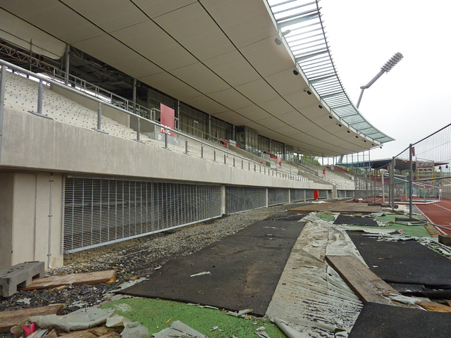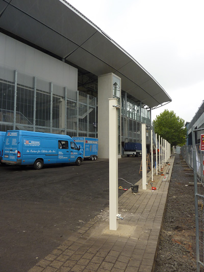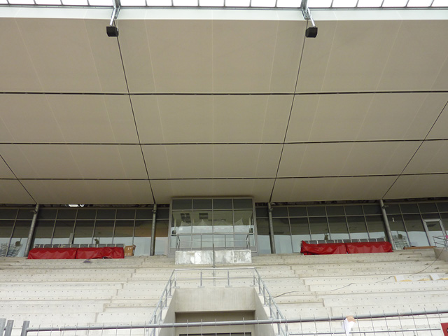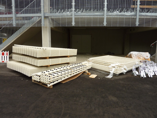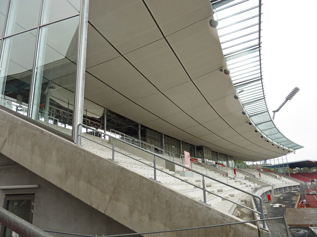 Tribünendachverkleidung, Vorplatz, "Probelauf" der Tribünenbeleuchtung und mehr