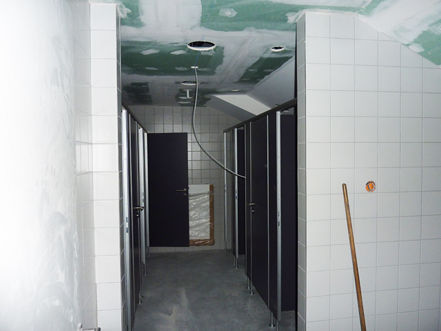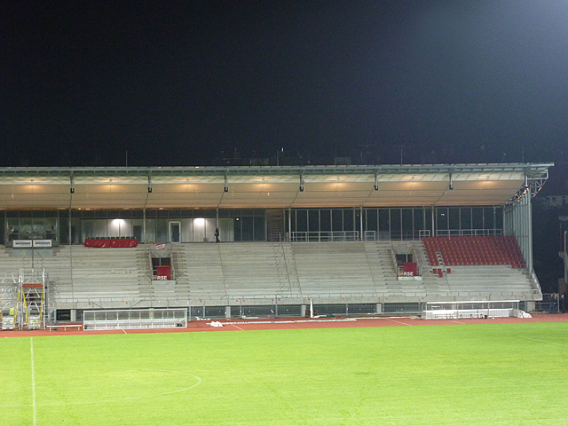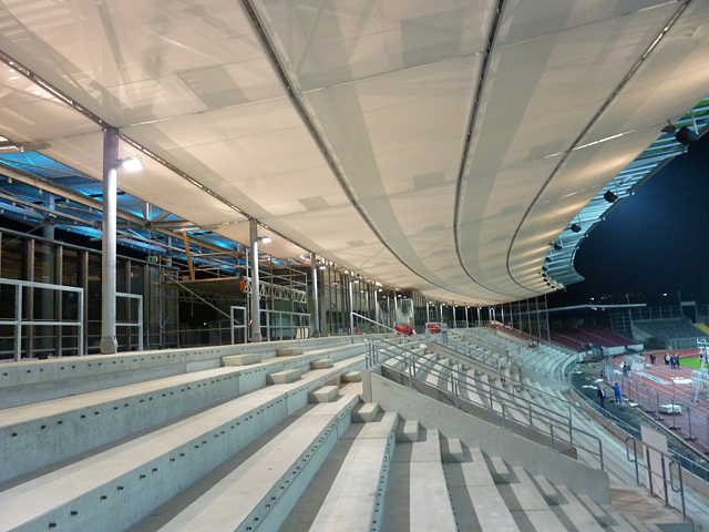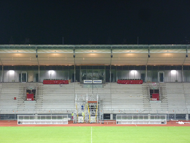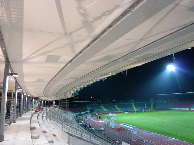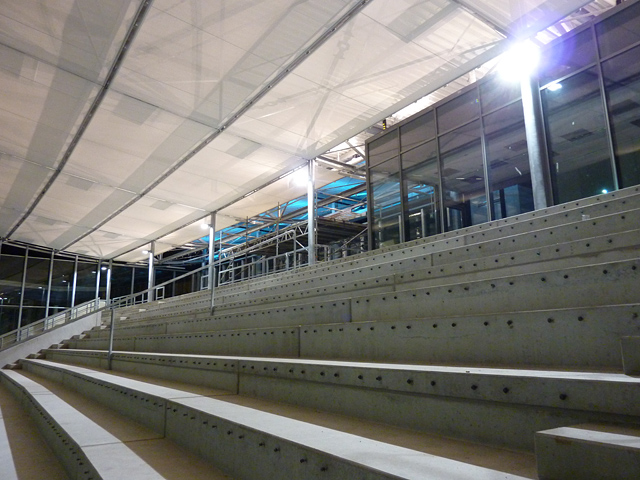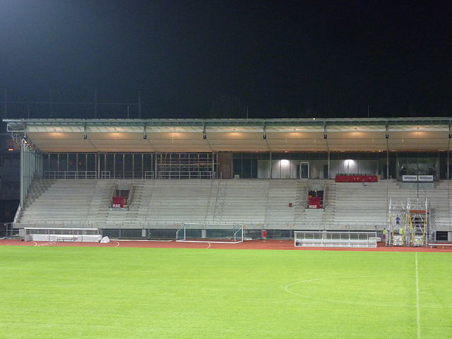 Tribünendachverkleidung, Vorplatz, "Probelauf" der Tribünenbeleuchtung und mehr