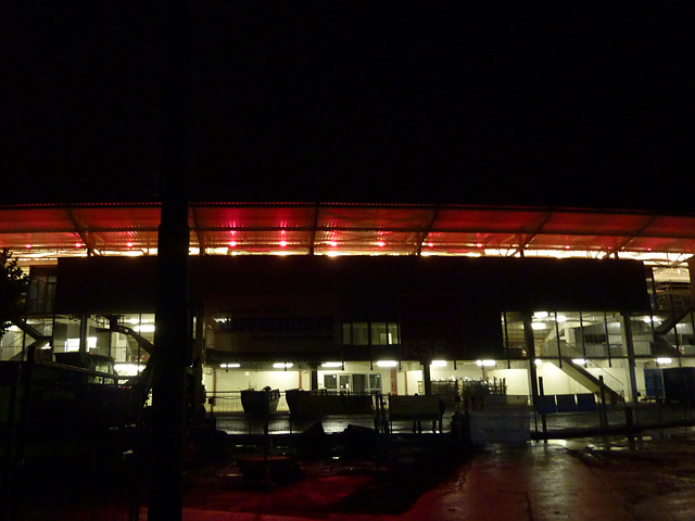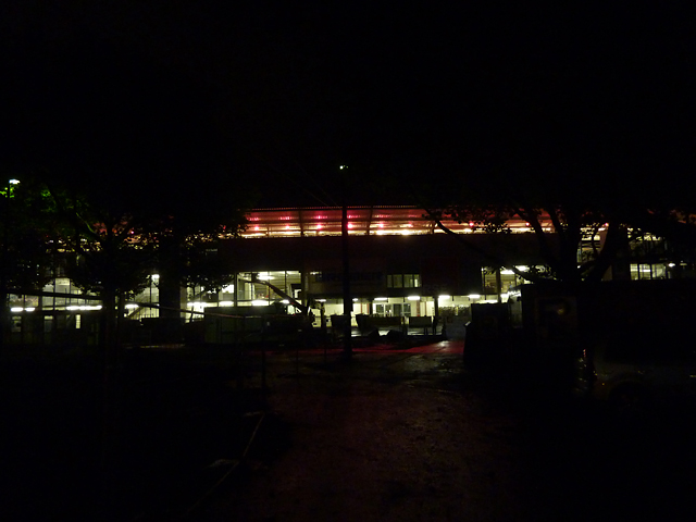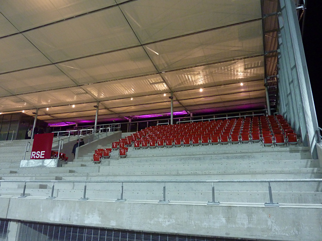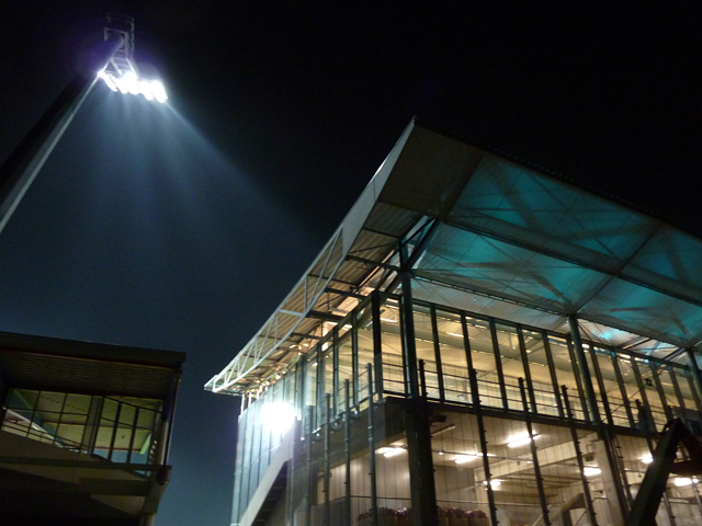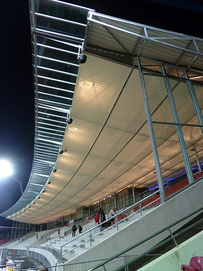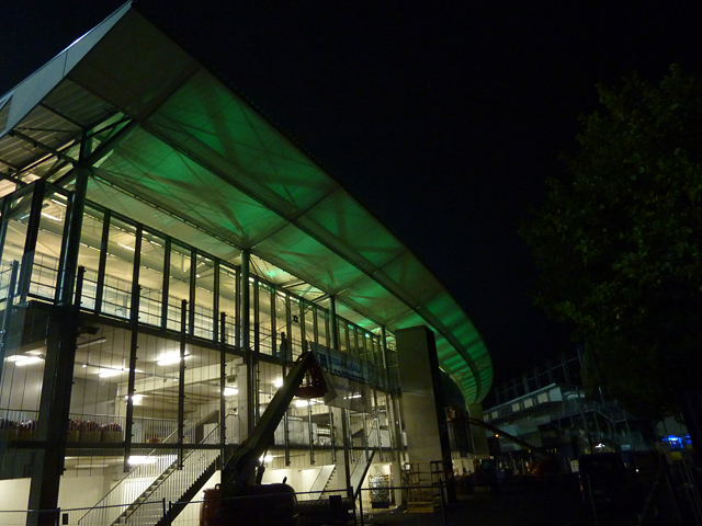 Tribünendachverkleidung, Vorplatz, "Probelauf" der Tribünenbeleuchtung und mehr