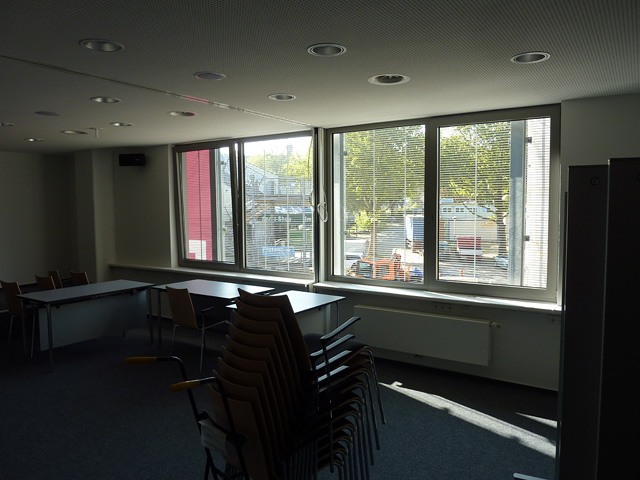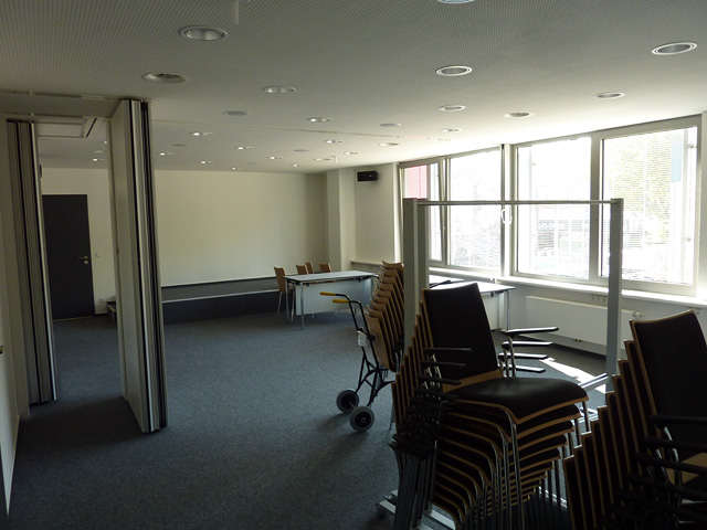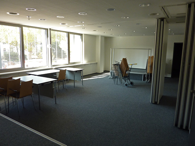 Wie man sieht, kann dieser Raum durch faltbare Schiebewände abgeteilt werden.